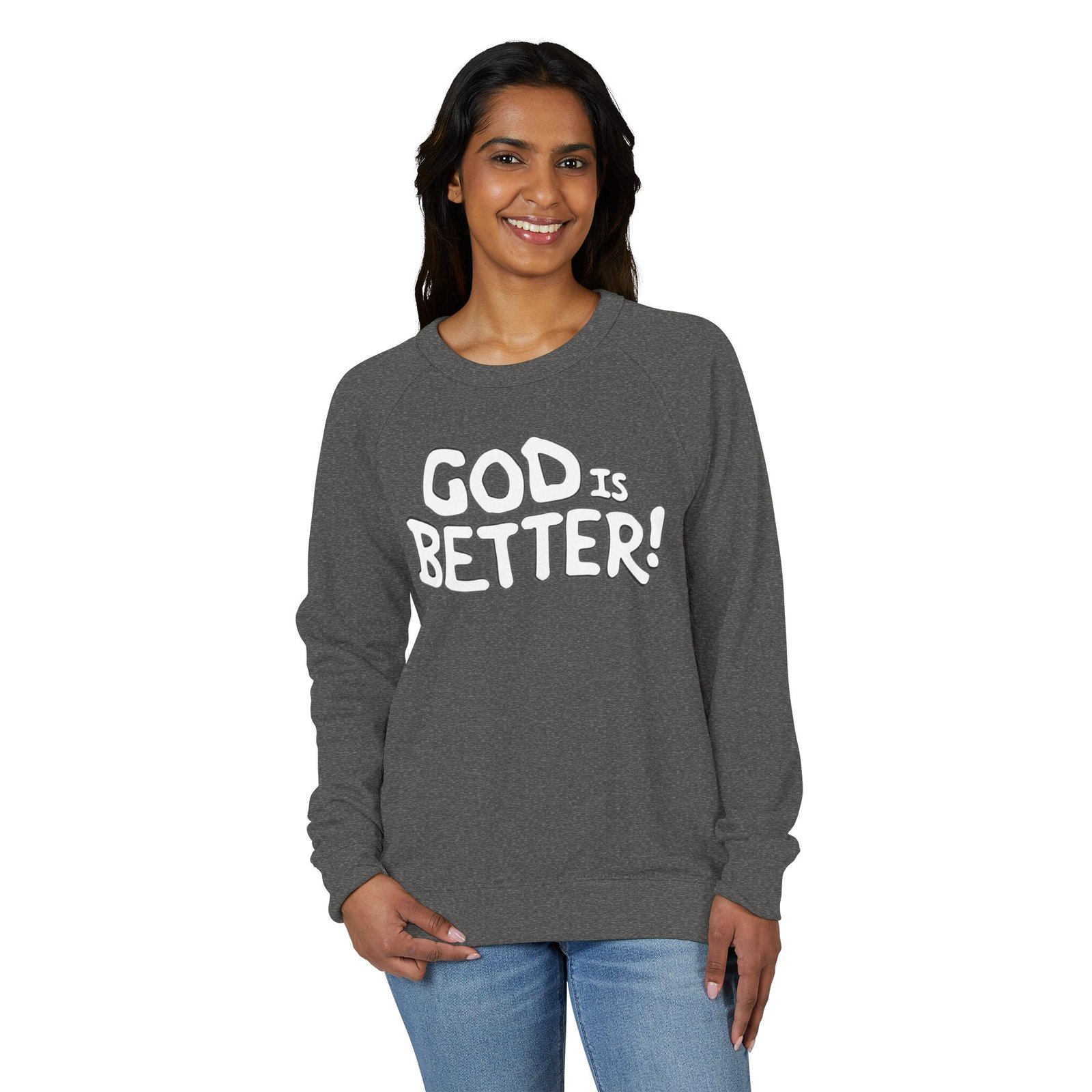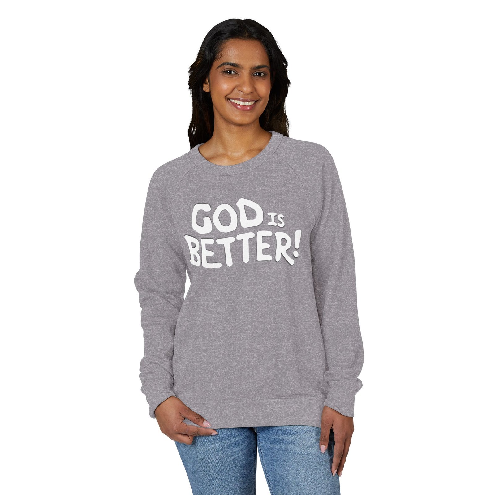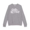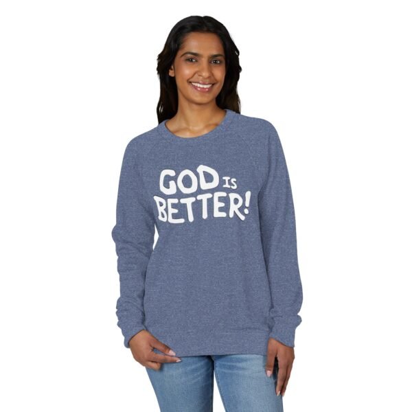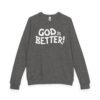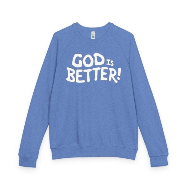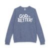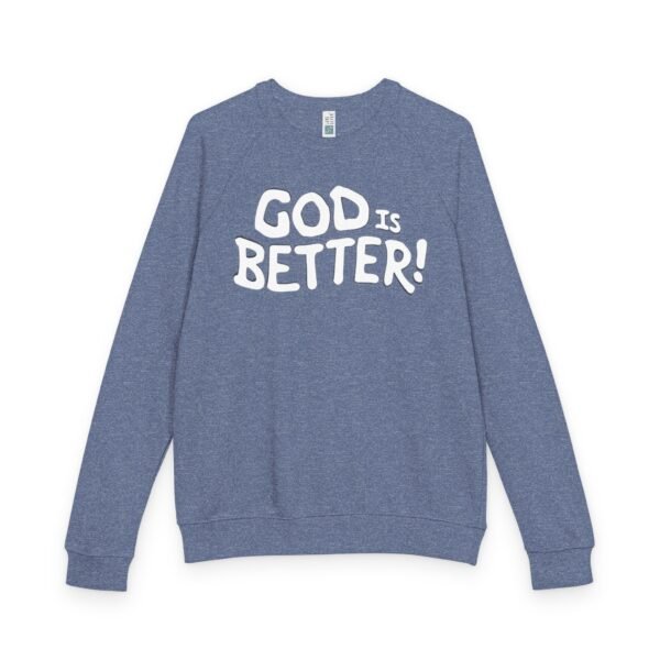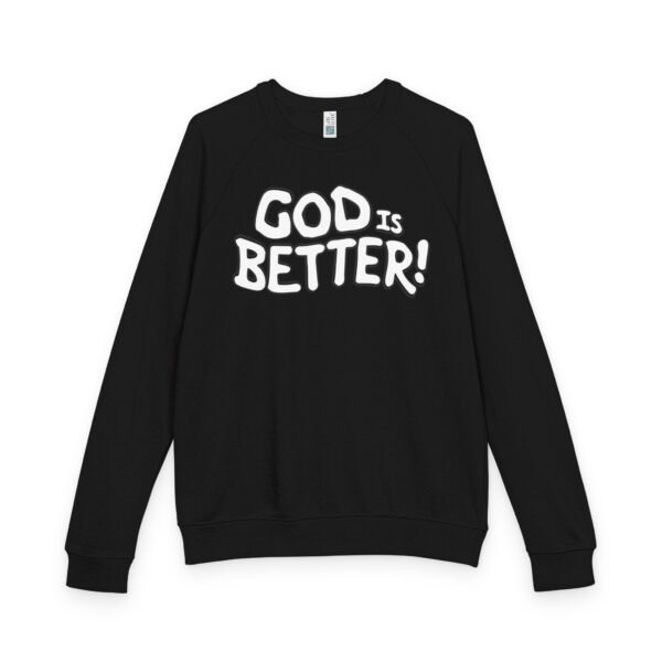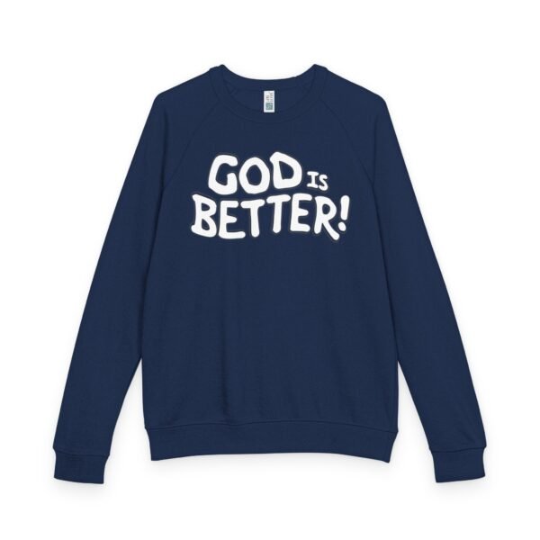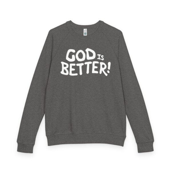 A soft, midweight crewneck that reads like a quiet declaration. This French terry sweatshirt settles in with a lived-in feel — cozy ribbed cuffs and waistband, raglan sleeves for ease of movement, and a clean half-moon back neck detail that speaks to thoughtful construction. The bold, hand-lettered “GOD IS BETTER!” graphic sits centered on the chest, simple and sincere. Wear it during early-morning coffee runs, low-key church nights, or while curling up with a book; it layers easily under a coat or stands alone as a statement of faith and calm confidence. The fabric blend keeps the surface smooth and the inside softly looped, so it’s comfortable against skin and holds its shape through regular wear.