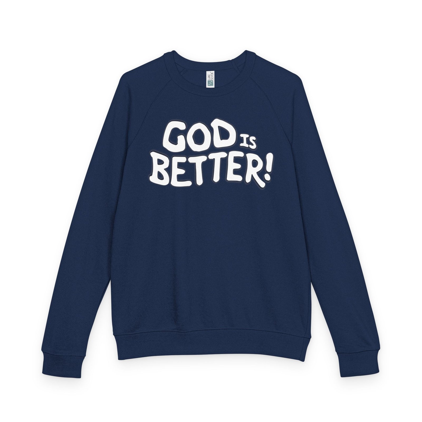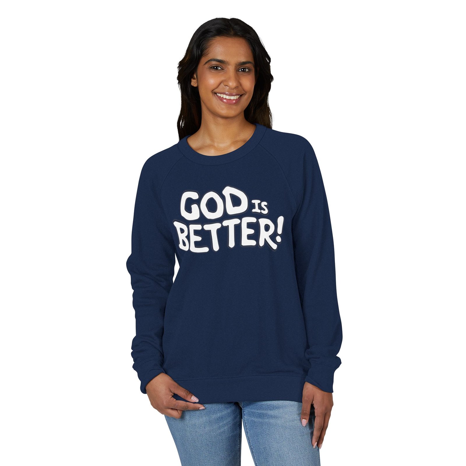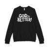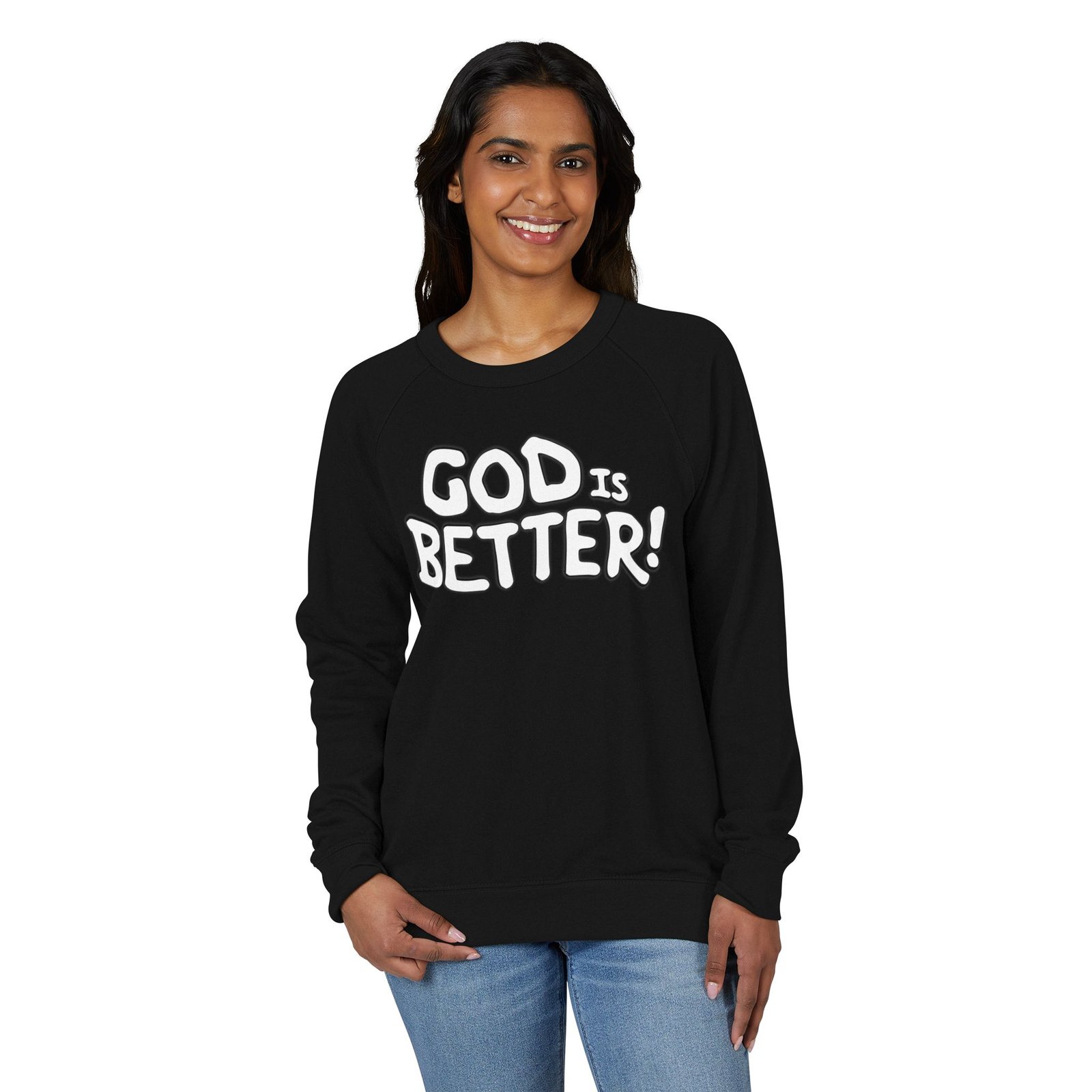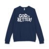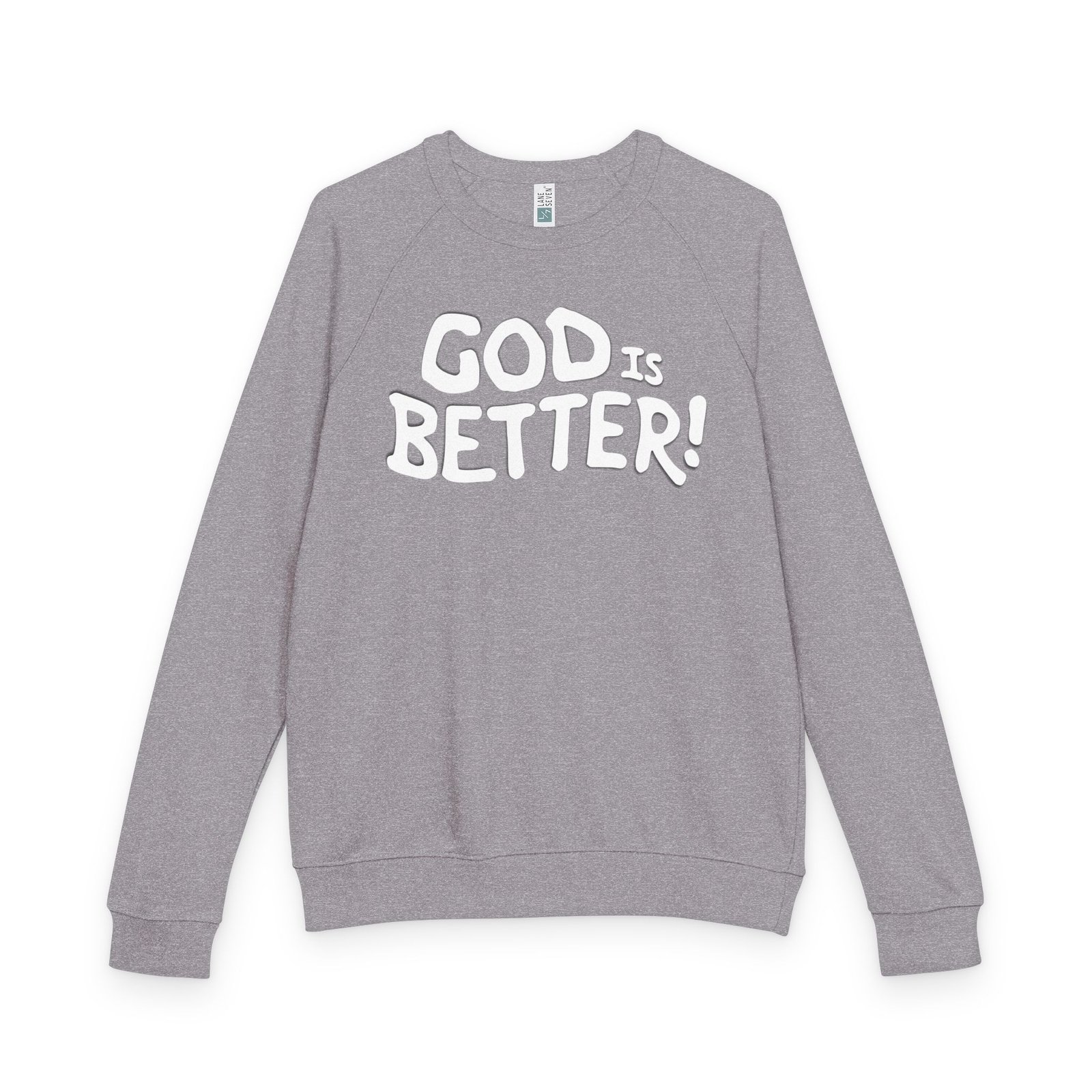 A soft, midweight crewneck that reads like a quiet declaration. This French terry sweatshirt settles in with a lived-in feel — cozy ribbed cuffs and waistband, raglan sleeves for ease of movement, and a clean half-moon back neck detail that speaks to thoughtful construction. The bold, hand-lettered “GOD IS BETTER!” graphic sits centered on the chest, simple and sincere. Wear it during early-morning coffee runs, low-key church nights, or while curling up with a book; it layers easily under a coat or stands alone as a statement of faith and calm confidence. The fabric blend keeps the surface smooth and the inside softly looped, so it’s comfortable against skin and holds its shape through regular wear.